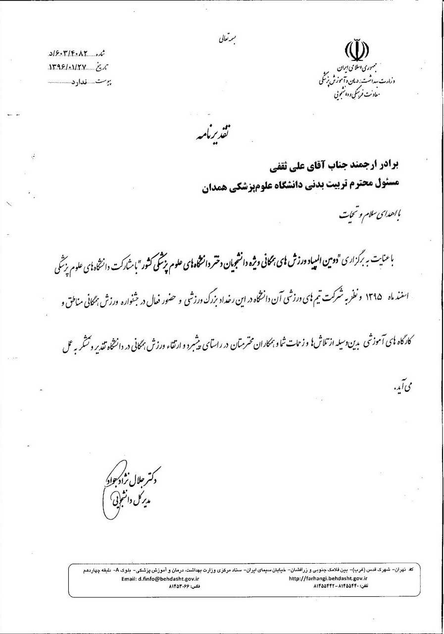 مدیرکل دانشجویی ، معاونت فرهنگی و دانشجویی وزارت متبوع از سرپرست تربیت بدنی دانشگاه علوم پزشکی همدان به منظور شرکت در دومین المپیاد ورزش های همگانی ویژه دانشجویان دختر دانشگاه های علوم پزشکی کشورتقدیر کرد.