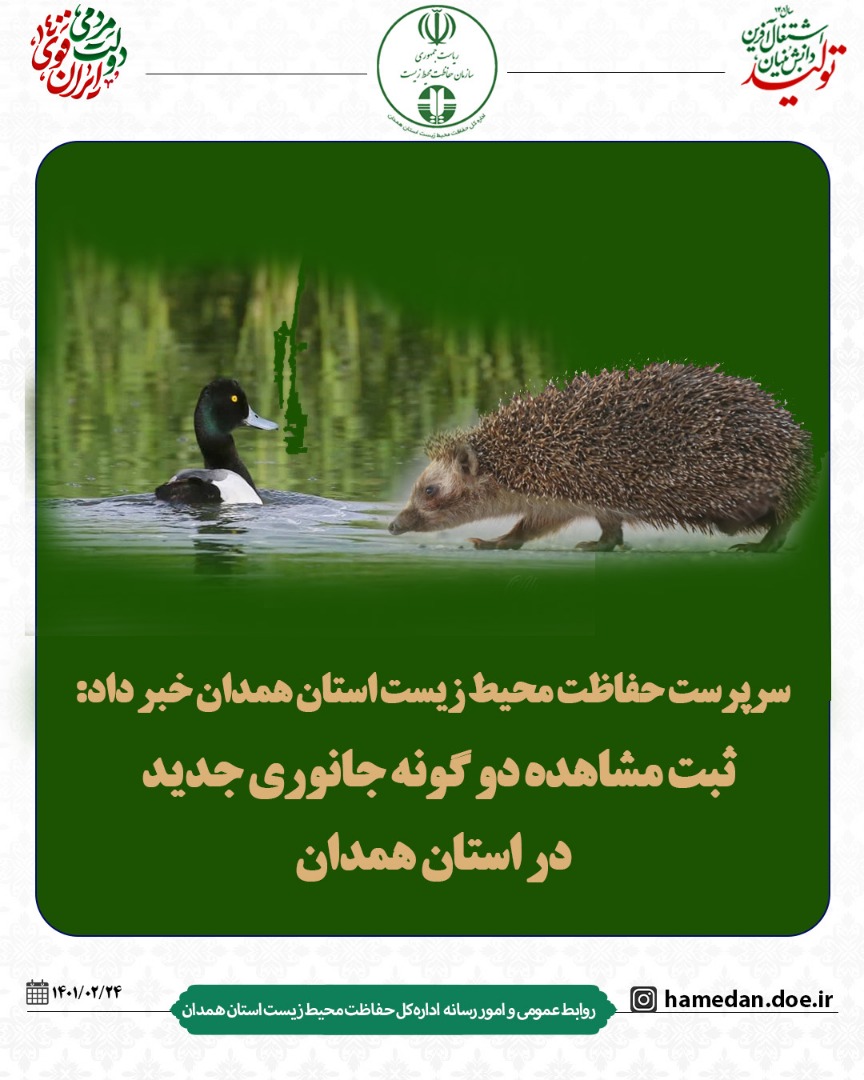 سرپرست حفاظت محیط زیست استان همدان ازشناسایی و ثبت رسمی دو گونه اردک سر سیاه و خارپشت اروپایی شرقی در این استان خبر داد.